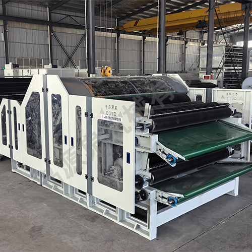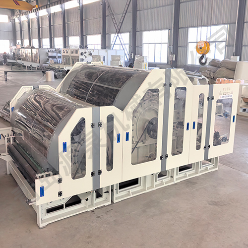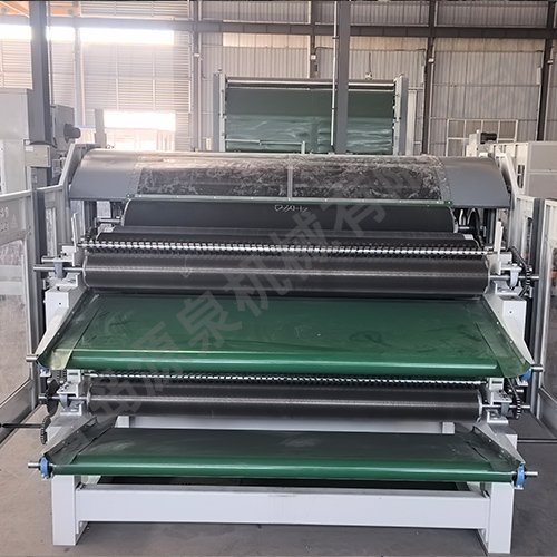 该机采用双锡林梳理,双道夫,双杂乱出棉,双罗拉剥棉,具有分梳能力强,梳理精度高等优点。喂入罗拉分上下两组配对,变频调速,并装有金属探测装置,具有自停报警功能。且自动送入铺网机斜帘,减轻操作工的劳动强度。